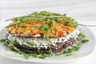 Поверх майонеза выложите немного пассерованных лука с морковью.