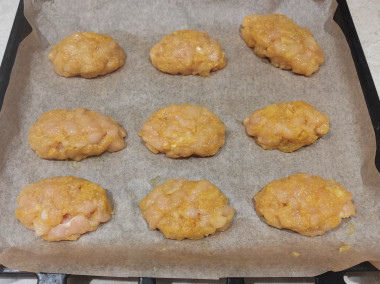 Ложкой сформируйте котлеты и выложите на их противень, застеленный пергаментом или силиконовым ковриком для запекания. Котлеты можно сделать как круглой формы, так и продолговатой. А с выбором пергамента поможет определиться статья по ссылке в конце рецепта.
