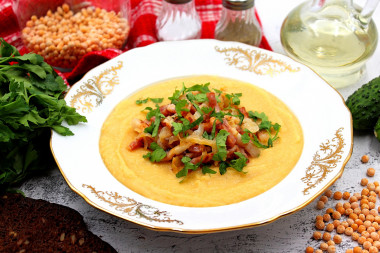 Подавайте готовое пюре с обжаренной свиной грудинкой и рубленой зеленью. Приятного аппетита!