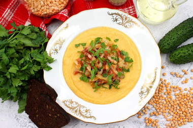 Правда, вместо воды я использовала куриный бульон, мне показалось так будет еще вкуснее. Паприку и базилик я, вообще, не использовала. Да и растительное масло мне ни капли не понадобилось. Я сначала слегка вытопила жир из грудинки, затем добавила полукольца репчатого лука и обжарила грудинку вместе с луком на небольшом огне до золотистого цвета. В блендере я горох измельчила вместе с бульоном, получилось что-то вроде горохового крем-супа, однако после остывания пюре немного загустело. Если же Вам хочется, чтобы гороховое пюре имело более густую консистенцию, лучше добавляется в блендер не всю жидкость сразу, а порциями. Автору большое спасибо, а рецепт пошел в копилочку!