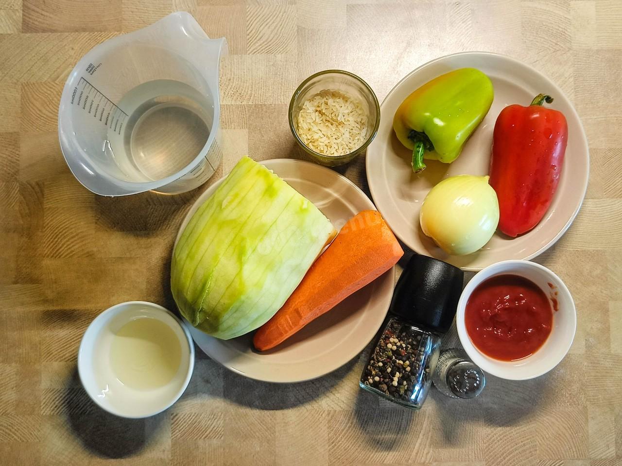 Подготовьте необходимые продукты. Овощи помойте и очистите. Если кабачки зрелые, снимите с них кожуру и удалите семена. Рис тщательно промойте до прозрачной воды. О тонкостях выбора риса читайте статью под шагами