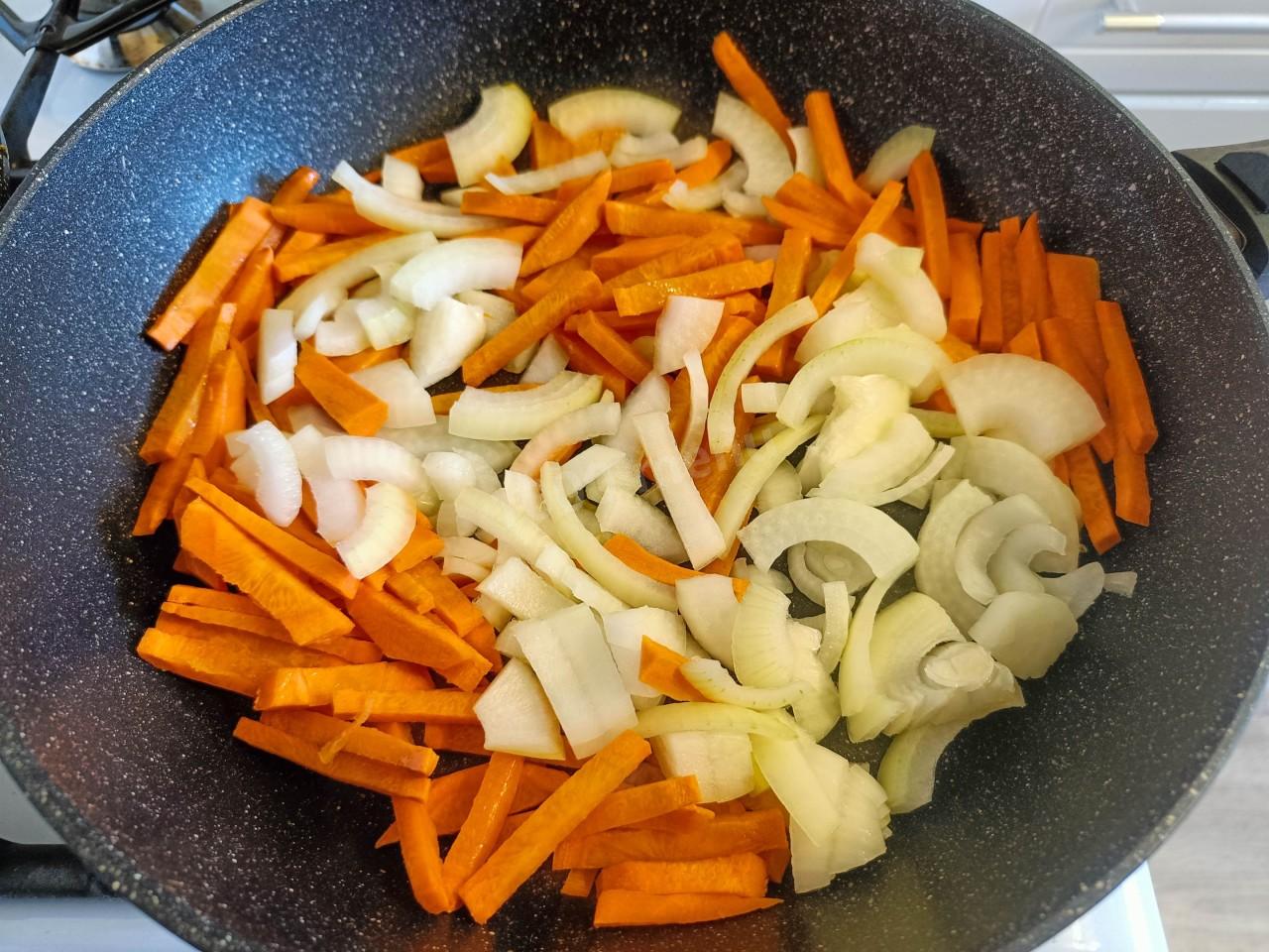 В отдельной сковороде разогрейте остальное масло и обжарьте лук и морковь на среднем огне до мягкости 2-3 минуты. В материалах под шагами можно прочитать, какие еще масла можно использовать, кроме подсолнечного.