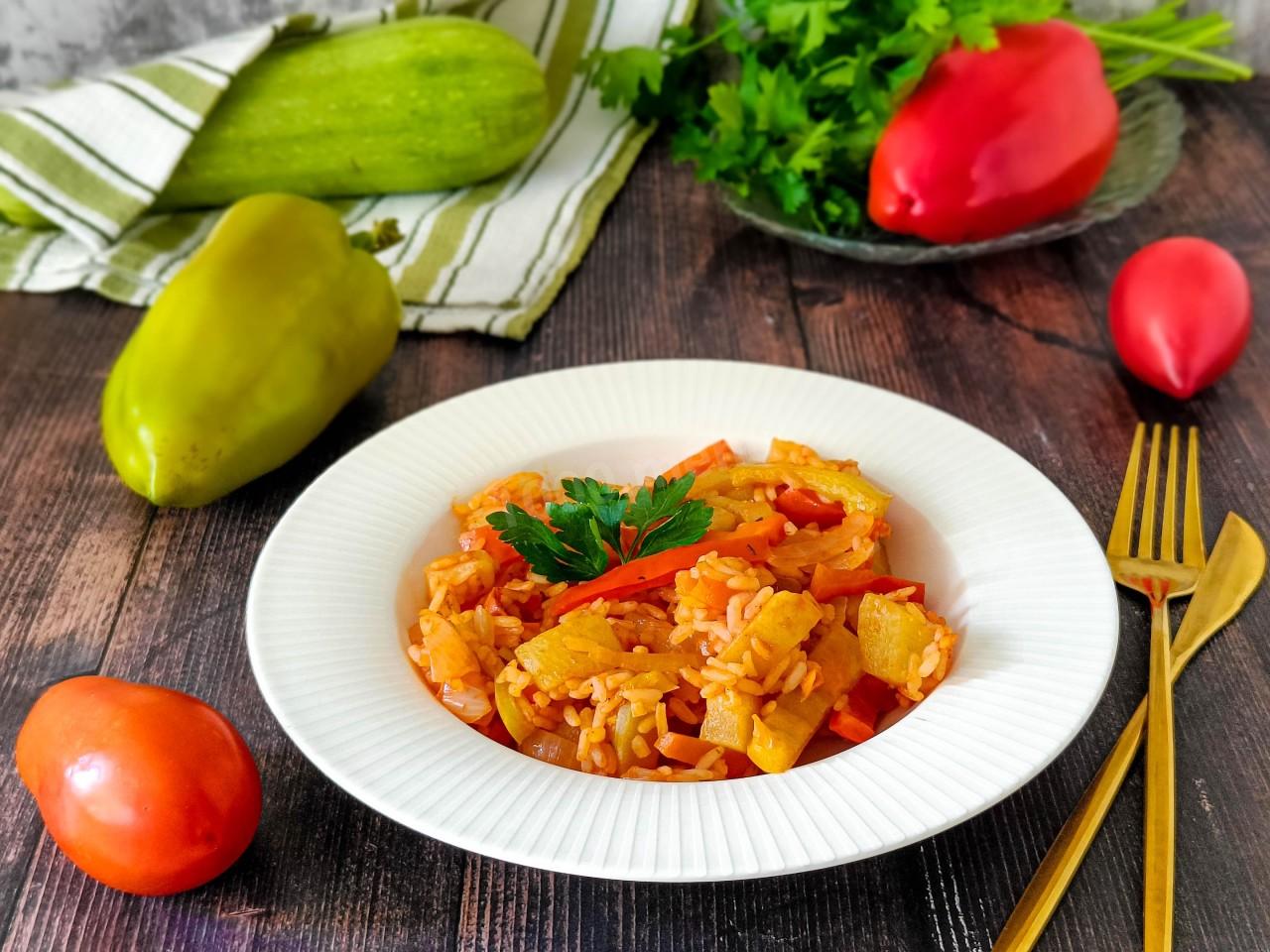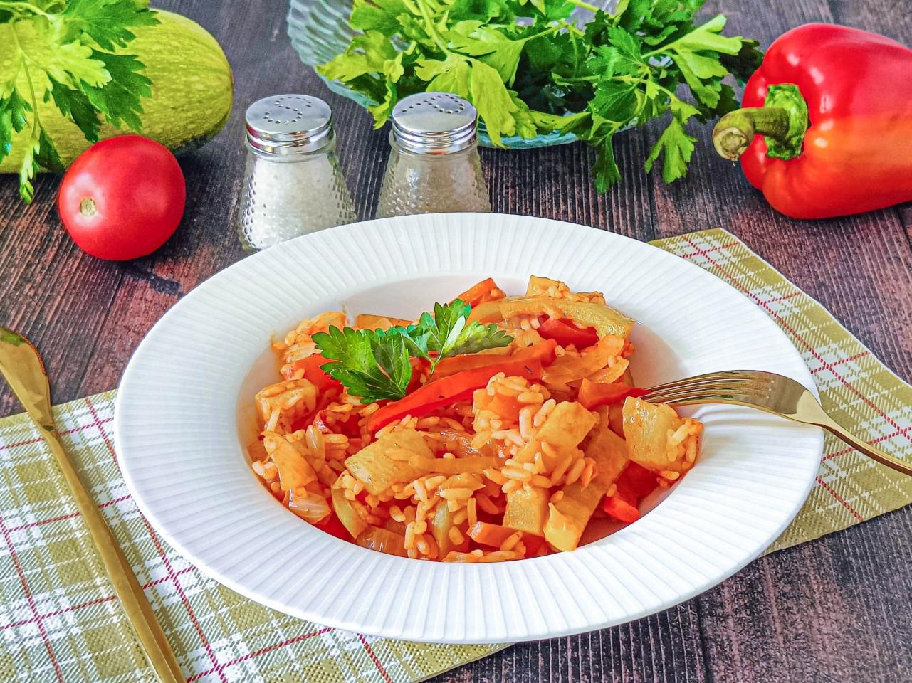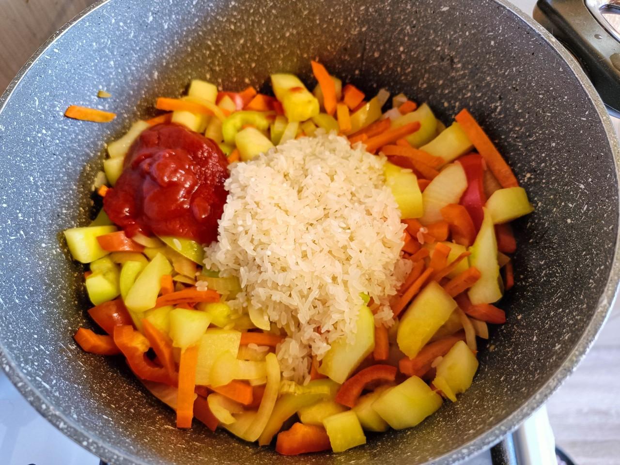 К кабачкам добавьте обжаренный лук с морковью и готовьте все вместе еще 2-3 минуты. К овощам добавьте промытый рис и томатную пасту. Чем можно заменить томатную пасту? Томатную пасту можно заменить протертыми свежими помидорами, томатным соком, кетчупом или соусом для пасты. Налейте кипяток. По вкусу приправьте молотым перцем и солью.