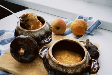В горшочки (у меня объем каждого 500 мл) разложите куриное филе. У меня данного количества ингредиентов хватило на 4 горшочка.