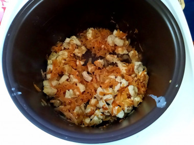 Нарезанную морковь сразу же всыпьте к курице с луком, добавьте соль и приправы, перемешайте и готовьте еще минуты две, после чего программу жарки отключите. Или же она закончится сама, в зависимости от модели.