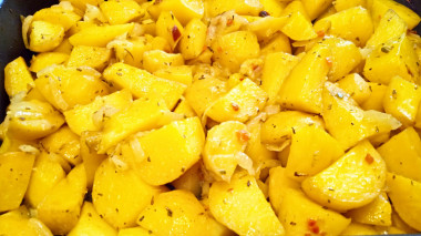 Замечательная запеченная картошка получилась. Судя по фотографиям, автор готовила её не в духовке, а в микроволновке. Я готовила в духовке, перемешивала один раз через 20 минут, второй раз через 20 минут, подержала ещё 10 минут, и блюдо было готово, Запекала при температуре 180 градусов. Из специй добавила универсальную овощную приправу и розмарин. Это, конечно, не быстрое приготовление, но результат того стоит. Особенно если готовить одновременно два блюда. Я готовила ещё и мясо. Картошка получилась очень вкусная, ароматная, с хрустящей корочкой и воздушная внутри. Раньше я так запекала картошку, но почему-то не добавляла лук. А нам очень понравилось с луком. Рекомендую этот вкусный рецепт Картофель запеченный с луком в духовке, готовьте с удовольствием.