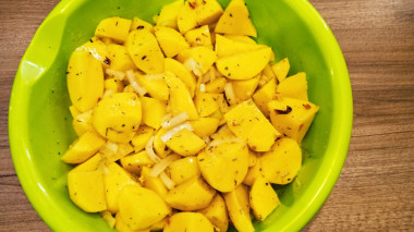 Теперь тщательно перемешиваем руками картофель и лук с растительным маслом, солью и специями. Тем временем включаем духовку и разогреваем ее до 200 градусов.