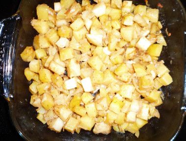 Через 40 минут форму достаем из духовки и аккуратно ложкой перемешиваем картофель и лук снизу вверх.