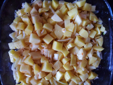 Помещаем нарезанные картофель и лук в форму для запекания, добавляем смесь соли и специй.