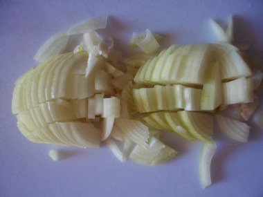 Репчатый лук нарезаем не очень тонкими, толщиной около 5 мм четвертькольцами.