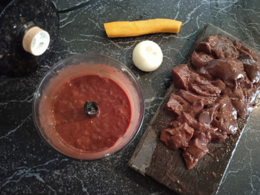 Свиную печень вместе с морковью, луком и зеленью пропустите через мясорубку или измельчите в блендере. Если у вас небольшой блендер, то печенку лучше измельчайте частями, так как большой объем трудно перемолоть и прибор может перегреться. Если есть кухонная машина, то в ней можно измельчить весь объем печени.