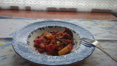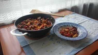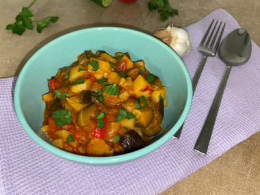 В зимнее время года можно сделать более сытный вариант овощного рагу, добавьте мясо и капусту, исключив баклажаны и фасоль, к примеру. А помидоры можно заменить томатной пастой, или томатами в собственном соку.