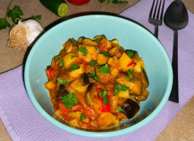 Замечательный рецепт Овощное рагу в кастрюле: автор сделал подробное описание с яркими фото, посоветовал, что можно трасформировать. Конечно же это не первое мое рагу, но готовила по рецепту автора, учитывая советы по количеству продуктов и размеру (!) их нарезки. И правильно сделала, не смотря на некторые сомнения и спорные (для меня) сочетания продуктов. Структура и вкус оаощей хорошо между собой сочетается: сладость картофеля, кислинка томатов, нейтральность фасоли, индивидуальность баклажана. Вкусно! Ароматно! Полезно! Быстро! Отлично как гарнир, так и в качестве самостоятельного блюда.