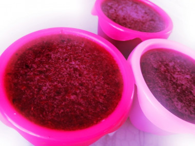 Так как ягоды замороженные, им нужно дать немного времени, чтобы оттаять. С помощь блендера измельчаем смородину до пюреобразного состояния, затем протираем через сито, чтобы на выходе получить идеально чистую фруктовую мякоть без шкурок и косточек. В протертую мякоть добавьте воды, чтобы получилось всего 200 мл (у меня получилось 100 мл ягодного пюре, я добавила 100 мл остывшей кипяченой воды, если пюре выйдет меньше, добавьте больше воды и наоборот).