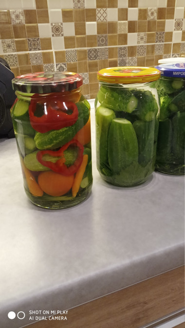 1. Огурцы вымойте и срежьте кончики, помидоры помойте. Чеснок очистите. Болгарский перец почистите и нарежьте крупными дольками.
