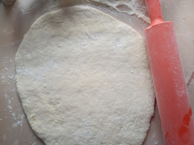 Затем раскатываем тесто скалкой примерно в полсантиметра толщиной.