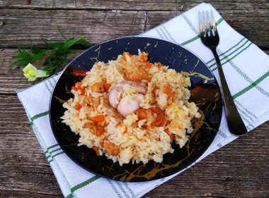 Плов готовлю часто, мы его очень любим. Но я даже не знала, что мясная основа называется "зирвак") В этот раз готовила его особенно тщательно. Тоже отделила сало и вытопила из него жир, к шкваркам добавила мясо и обжарила все вместе. В рецепте указано много лука и моркови. Решила все сделать по рецепту. И должна признаться, мне это очень понравилось. Большое количество лука придало невероятную сочность плову, а морковь дала не только красивый цвет, но и яркий вкус. Мне не особо нравится зира, поэтому из специй взяла черный свежемолотый перец. Головка чеснока придала приятный чесночный аромат. Плов вышел нежным, вкусным. Особенно горячий, только с плиты. Спасибо автору за этот замечательный рецепт!