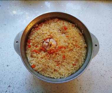 Плов доведите до кипения, убавьте огонь, плотно накройте крышкой и не открывайте ее как минимум минут 30. Проследите потом, чтобы вся вода впиталась и рис стал мягким. Готовому плову дайте настояться 10-15 минут под крышкой.