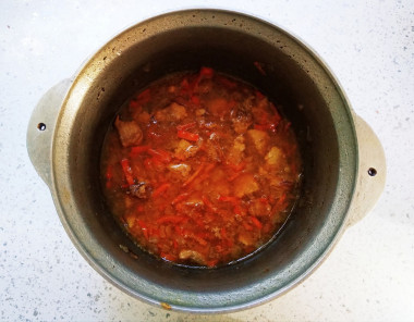 Затем сбавьте огонь до минимума и тушите зирвак на самом слабом огне 40 минут, накрыв казан крышкой.