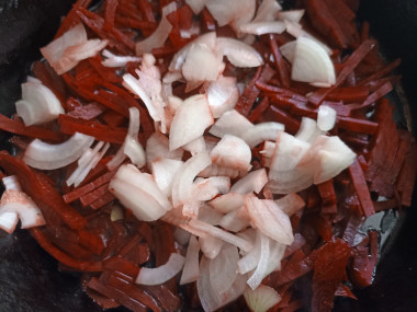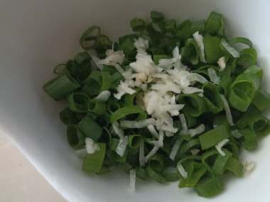 Вслед за свеклой выкладываем в борщ зеленый лук с чесноком.
