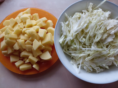 Через 20 минут добавляем нашинкованную капусту в кастрюлю к картофелю.