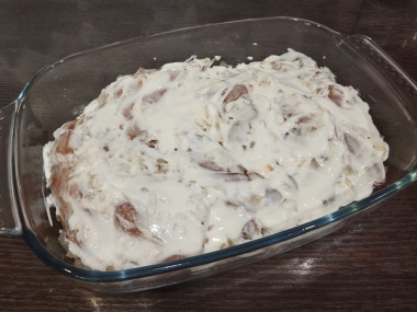 Залейте все сметаной. Благодаря сметане и сыру куриная грудка сохранит свою сочность - ведь ее так легко пересушить при запекании. А сметанно-сырная корочка предотвратит чрезмерное испарение влаги из курицы.
