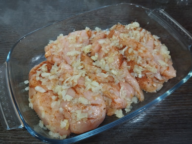 В форму для запекания выложите куриное филе. Сверху распределите обжаренные лук с чесноком.
