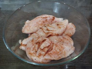 Куриное филе вымойте, обсушите. Можете сделать на каждом филе диагональные надрезы ножом. Натрите куриное мясо специями для курицы, солью и перцем. При использовании готовой смеси специй обязательно прочитайте на упаковке состав. Часто в таких смесях уже присутствуют соль и перец, учитывайте это, иначе рискуете пересолить и переперчить блюдо.