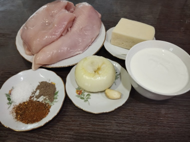 Как запечь куриное филе в сметане в духовке? Для начала подготовьте необходимые ингредиенты. Курицу можете использовать в виде бескостного филе без кожи, как у меня, а можете взять парочку целых куриных грудок с костями и кожей и разрезать их пополам. Но в таком случае время запекания может увеличиться. Сметану берите не очень водянистую, жирностью 15-20%