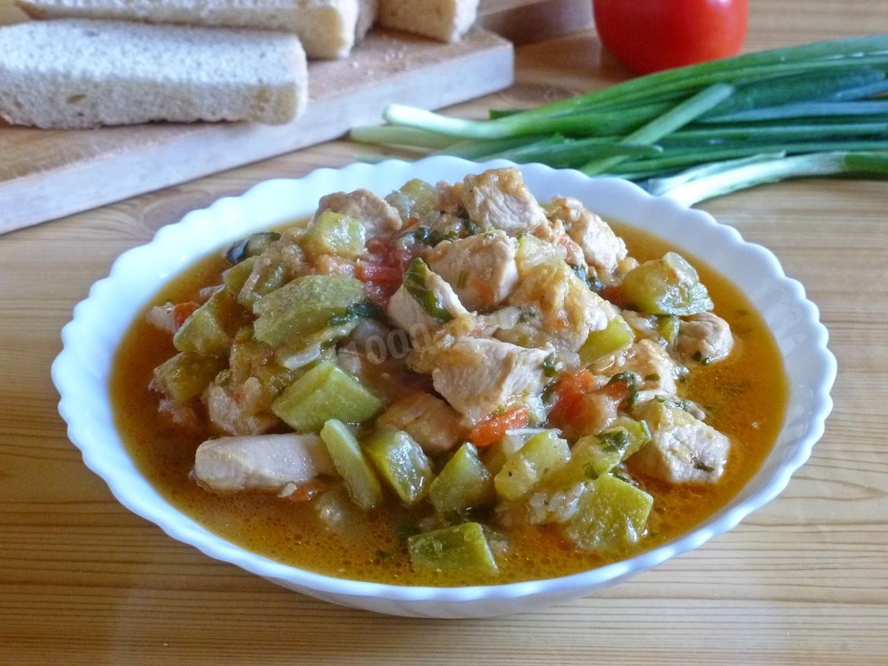 Сразу же выкладываем нарезанные кабачки и помидор в кастрюлю к курице и остальным овощам, все солим, хорошо перемешиваем и убавляем огонь на минимум. Воду добавлять не нужно, овощи при тушении дадут достаточно влаги.
