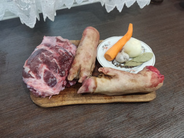 Как варить холодец из свиных ножек? Подготовьте требуемые ингредиенты. Части говядины подбирайте на свой вкус. Если мясо у вас заморожено, за ночь разморозьте его на нижней полке холодильника.