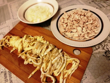 Пока курица варилась, замариновала мелко нарезанный лук. Из двух яиц сделала большой яичный блинчик - слегка перемешала яйца в миске, добавила немного соли, вылила на сковородку, жарила с двух сторон. Готовый блинчик нарезала узкими полосками. Сварила одно яйцо, которое затем использовала для украшения.