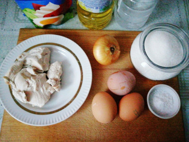 Ингредиентов немного, всего три - куриная грудка, яйца и лук. Первое, что сделала, разрезала на части курицу, отделила грудку. Отварила мясо в небольшом количестве воды, добавив щепотку соли, половину моркови, маленькую луковичку и лавровый лист. Курица в таком бульоне становится вкуснее и ароматнее. А сам бульон, тоже очень вкусный, можно использовать для приготовления супа или перекуса.