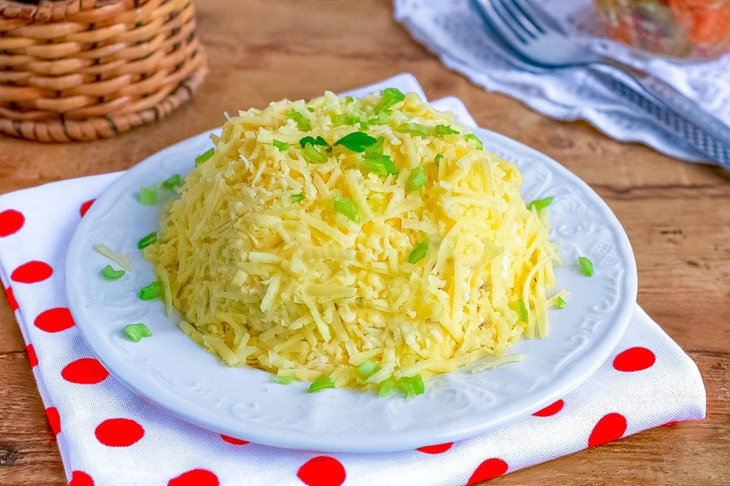 Последним слоем положите сыр, присыпьте им салат с боков и сверху. Уберите салат в холодильник на пару часов, чтобы слои хорошо пропитались майонезом.