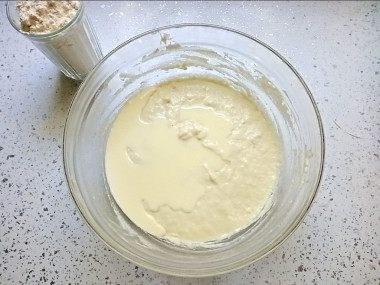 Опара для вкусного сдобного теста поднялась, а на ее поверхности образовалась пенная шапочка. Перелейте ее в миску с молочно-яичной смесью.