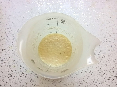 Как сделать опару? Налейте в емкость теплую воду (35-38 градусов). Раскрошите в воду свежие дрожжи. Добавьте 2 чайн. л. сахара и 3 ст. л. муки. Перемешайте, накройте полотенцем и оставьте на 10 минут. Масса должна вспениться и увеличиться примерно в 2 раза. Если этого не произошло, то нужно взять другие дрожжи, так как с этими выпечка не поднимется.