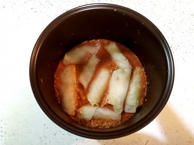 Выложите замороженные голубцы. Переключите мультиварку на режим "Запекание" примерно на 30 минут. Время может отличаться и зависит от возможностей вашей техники. Закройте крышку и оставьте готовиться. За это время голубцы можно перевернуть 1-2 раза и заодно проверяйте готовность блюда.