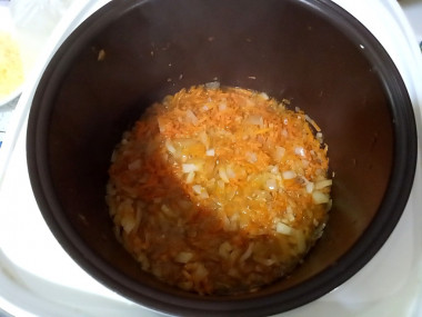 В чашу мультиварки налейте немного растительного масла. Я использовала режим "Жарка". Режимы вашей мультиварки могут отличаться. Выложите в горячую чашу подготовленные лук и морковь. Обжаривайте овощи 2-3 минуты, чтобы они стали мягче и появился характерный аромат. Об особенностях использования мультиварок и о том, как правильно выбрать масло для жарки, читайте в отдельных статьях, ссылки в конце рецепта.