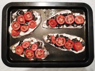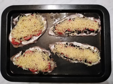 Помидоры помойте и нарежьте тонкими кружочками. Разложите нарезанные помидоры по грибам.