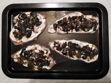 Из специй я использовала паприку, сушёный чеснок для грудки и чёрный перец в грибы. Грибы у меня были свои, лесные - подберезовики и подосиновики.