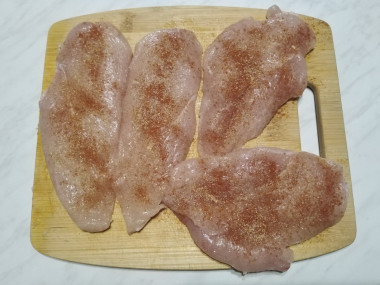 Филе куриных грудок разрежьте вдоль, чтобы получились вот такие большие кусочки. Каждый кусочек немного отбейте кухонным молоточком. Сильно бить не надо, так как куриное мясо очень нежное и его легко повредить.
