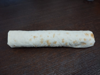 Завернуть пустые края лаваша на начинку, а затем свернуть лаваш в плотный рулет. Получившийся рулет завернуть в пищевую плёнку и убрать в холодильник на 2 часа. Готовый рулет из лаваша с печенью трески нарезать на порционные кусочки и подать к столу.