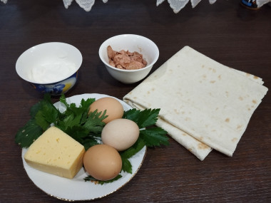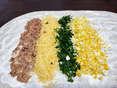 Яйца очистить от скорлупы, натереть на крупной тёрке. Выложить измельченные яйца на лаваш и сформировать плотную полоску. Затем рядом с яйцами выложить пару листья салата, тоже полосочкой. С печени трески слить лишнее масло, а затем размять печень вилкой, выложить на лаваш рядом с листьями салата. Сыр натереть на крупной тёрке и выложить последней полоской. Таким образом у нас получилось 4 полосочки из начинки.