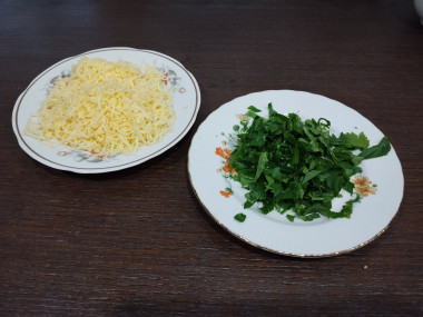 Пока отваривались яйца, натерла сыр на тёрке, измельчила зелень( я брала листья сельдерея), с печени трески слила масло и размяла вилкой .Яйца остудила и мелко порезала.