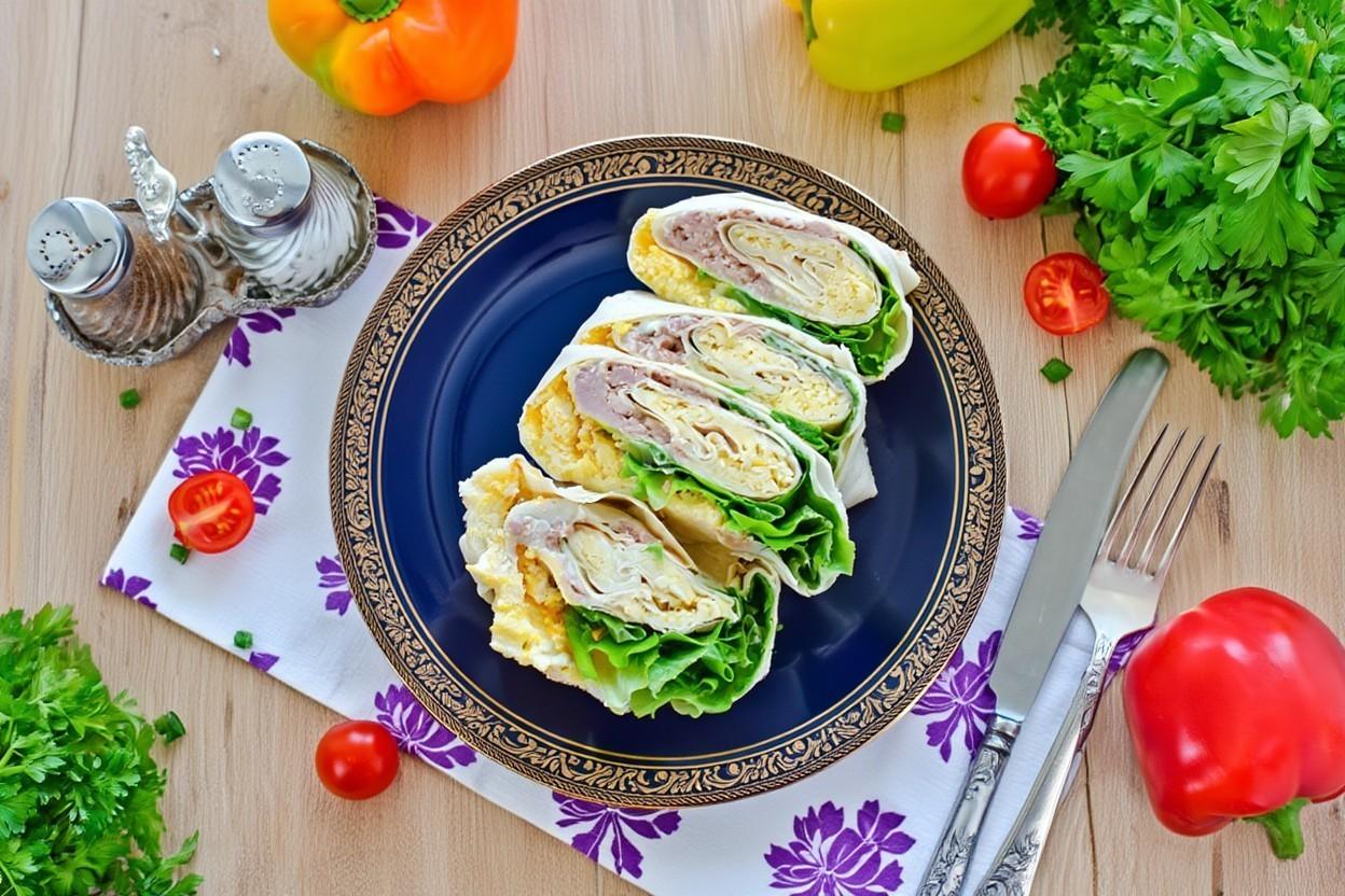 Завернуть пустые края лаваша на начинку, а затем свернуть лаваш в плотный рулет. Получившийся рулет завернуть в пищевую плёнку и убрать в холодильник на 2 часа.