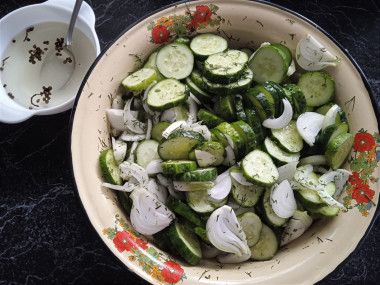 Чтобы сохранить хруст и усилить вкус заготовки, переложите огурцы и лук в большую миску, посолите и оставьте на полчаса. За это время огурцы пустят сок.