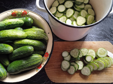 Промойте огурцы и срежьте кончики. Нарежьте огурцы тонкими полукольцами. При такой нарезке огурцы равномернее пропитаются специями, не будут сильно хрустеть и равномернее заполнят банку.