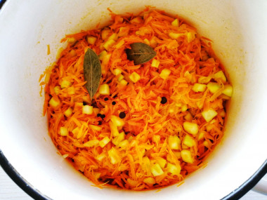 Овощи выложите в глубокую эмалированную кастрюлю. Влейте в нее растительное масло. Добавьте сахар, соль, черный перец горошком, пару горошин душистого перца, лавровый лист.