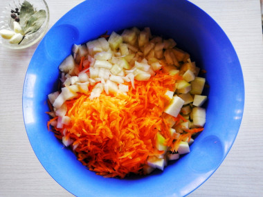 Сделала сегодня кабачки с луком и морковью на зиму. Взяла для готовки кабачок среднего размера, морковь, лук и чеснок. Кабачок и лук нарезала маленькими кубиками, морковь натерла на крупной терке. Зубчики чеснока измельчила ножом.