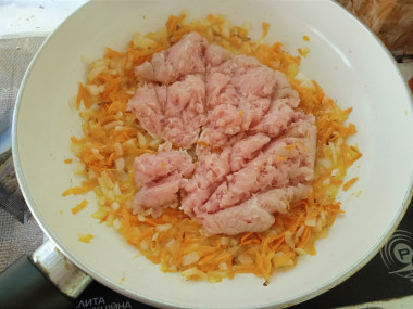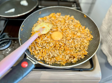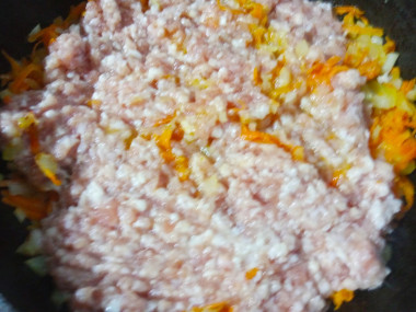 Добавьте мясной фарш. Перемешайте его с морковью и оставьте жариться на среднем огне (у меня это режим 5), разбивая комочки. Очень важно разбить все крупные комочки, чтобы добиться однородности начинки.